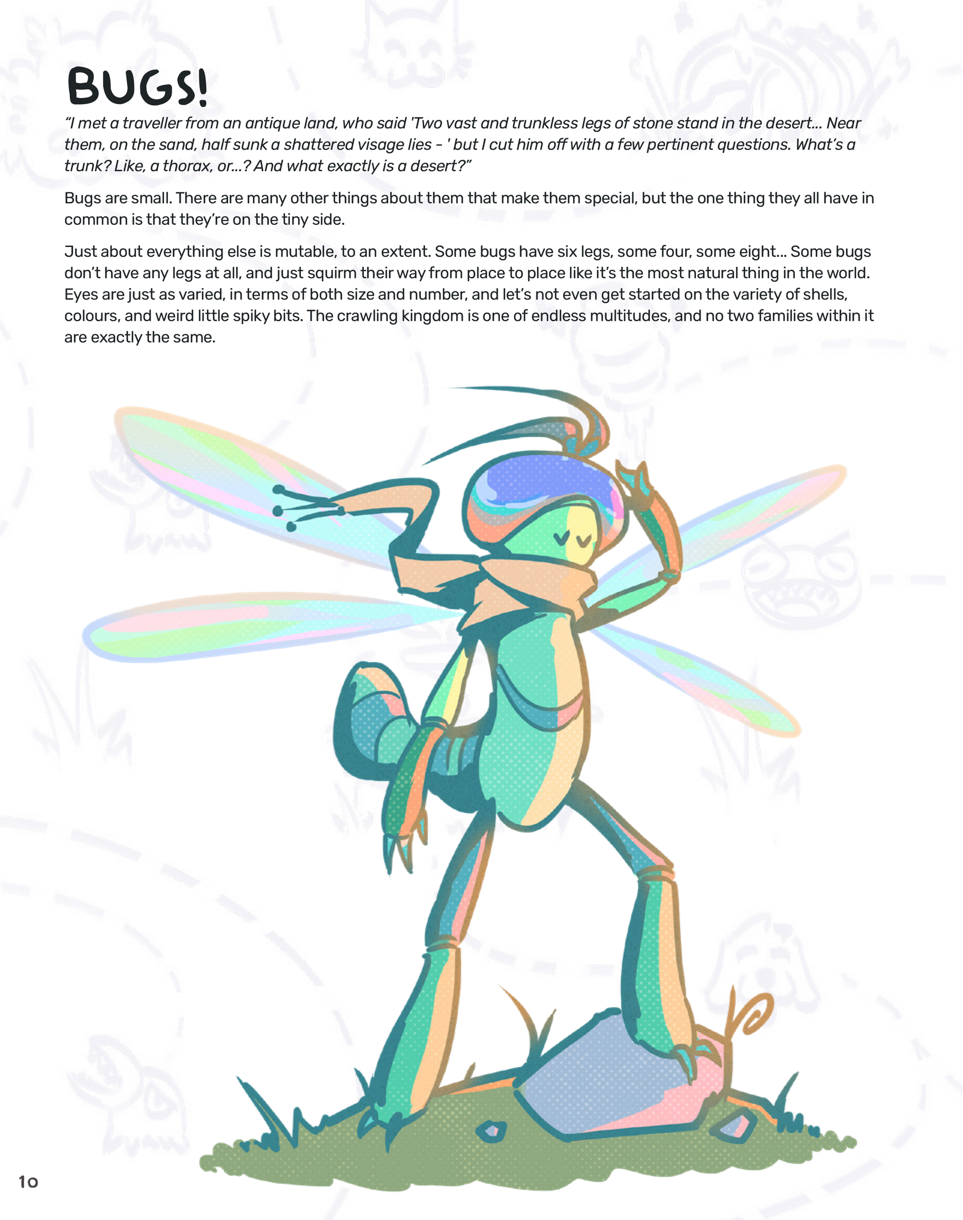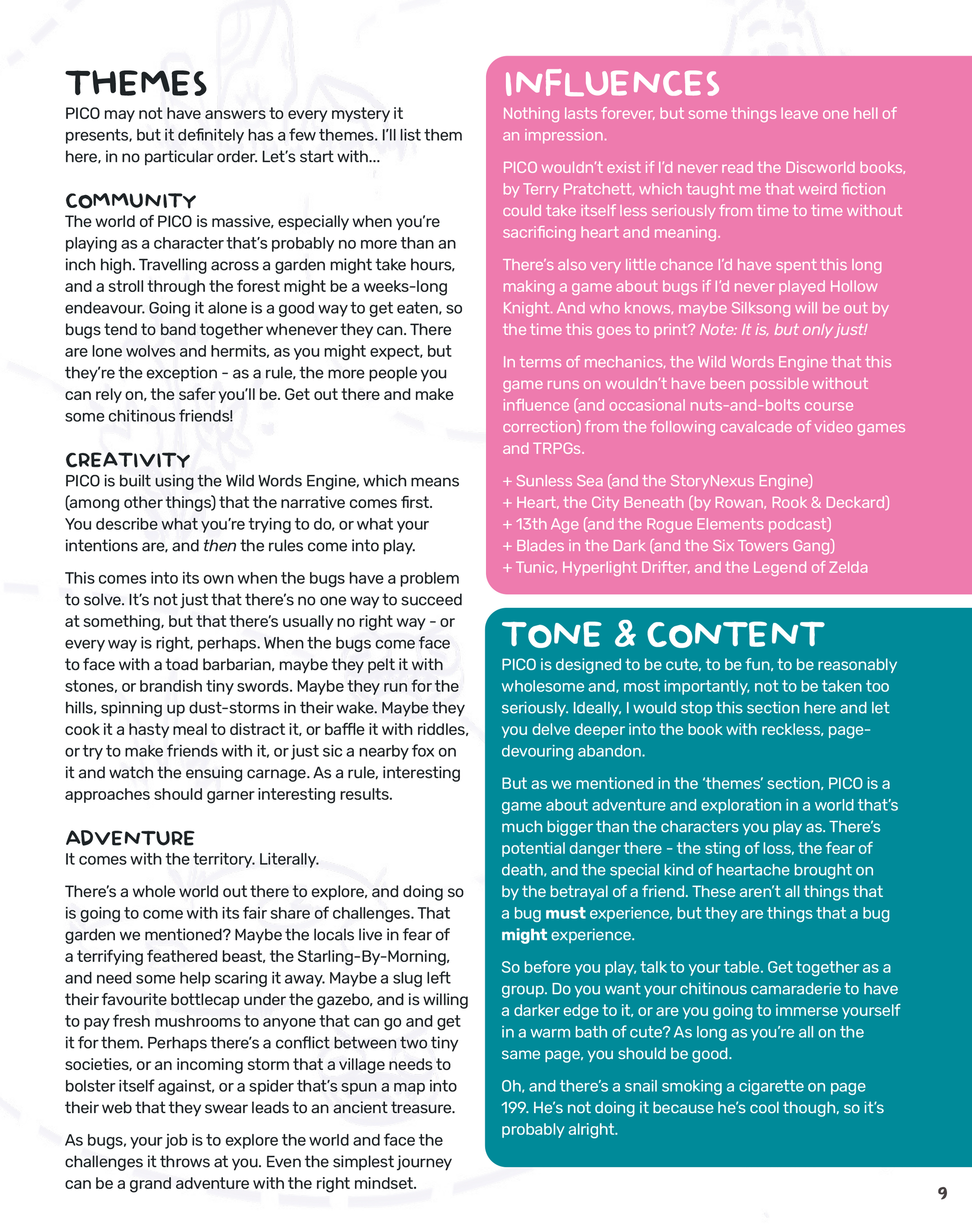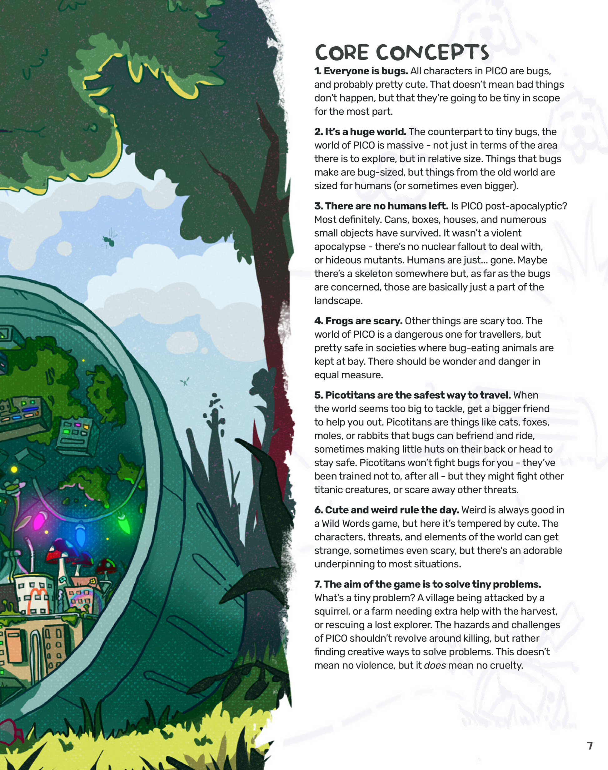Pico is a tabletop roleplaying game for 2-6 players where you play as tiny bugs banding together to explore, make friends, and solve mysteries!