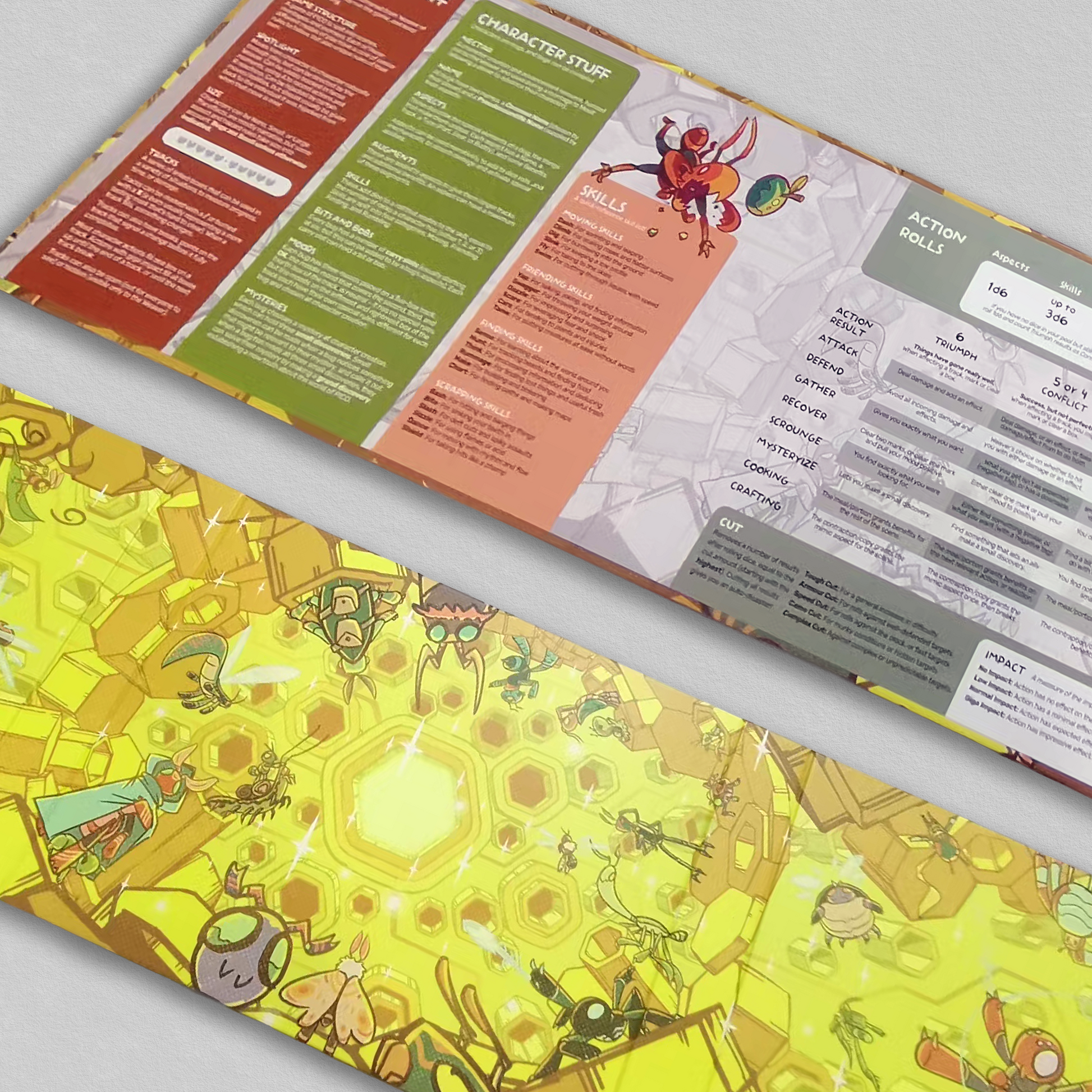 Guide your little bugs with the Weaver's Screen, a three-panel GM screen that comes with a complete summary of PICO's core rules, covering everything from Tracks to Moods to the Mysteriocalypse, keeping your adventures flowing smoothly from moment to moment.