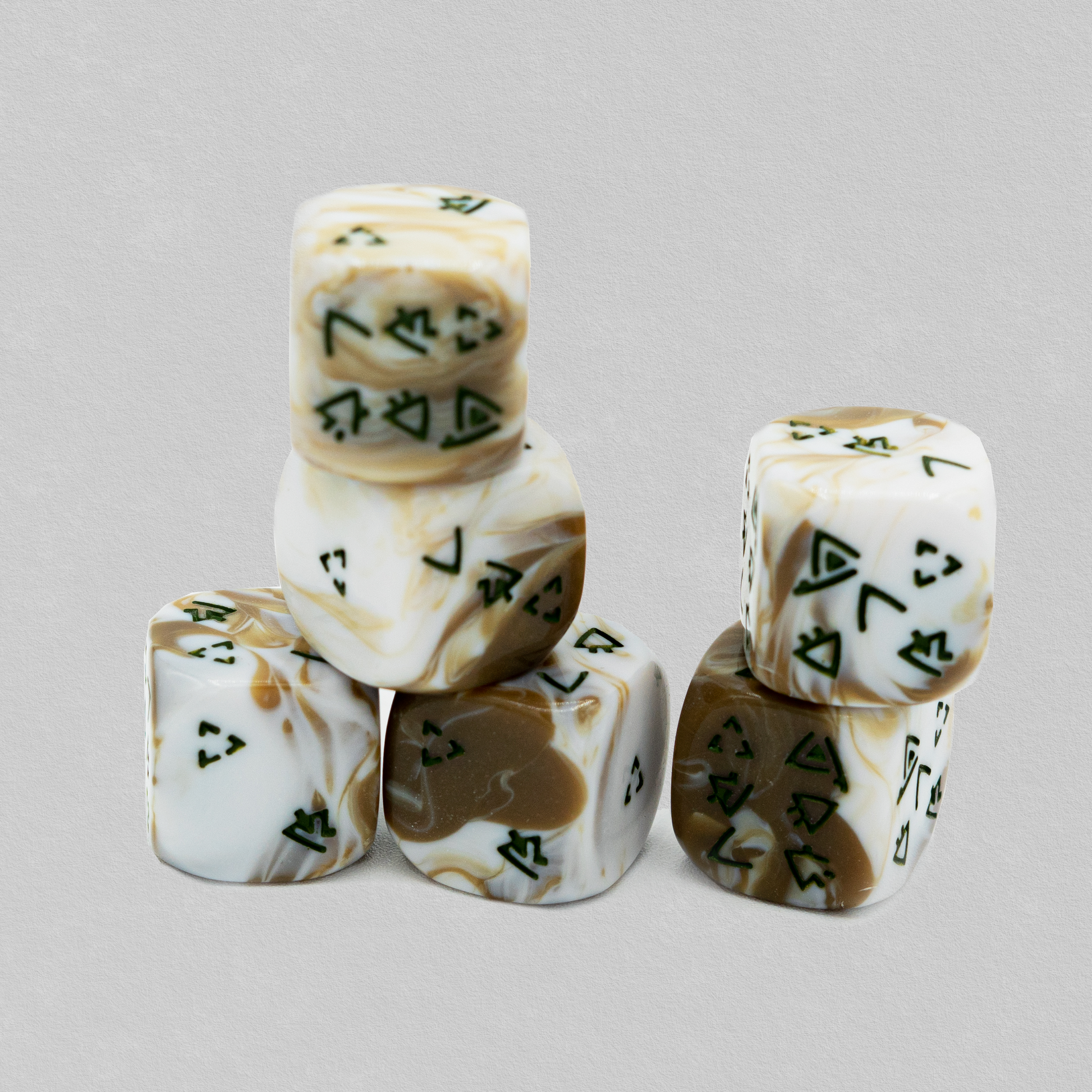 This six piece dice set is perfect for your games of The Wildsea. Read the dice faces like you would a standard six-sided die, with the configuration of the pips as your guide.