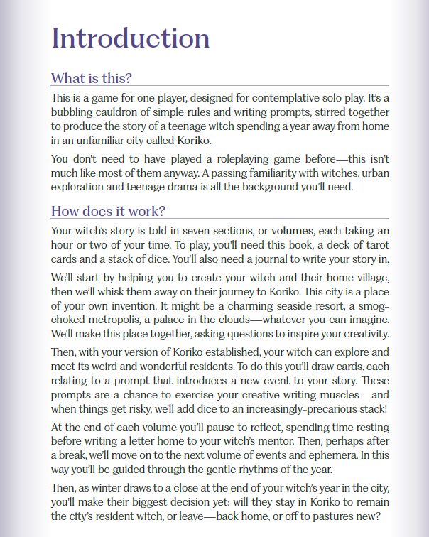 "Koriko: A Magical Year" is a contemplative solo journaling game that explores the life of a teenage witch spending a year in the distant and unfamiliar city Koriko.