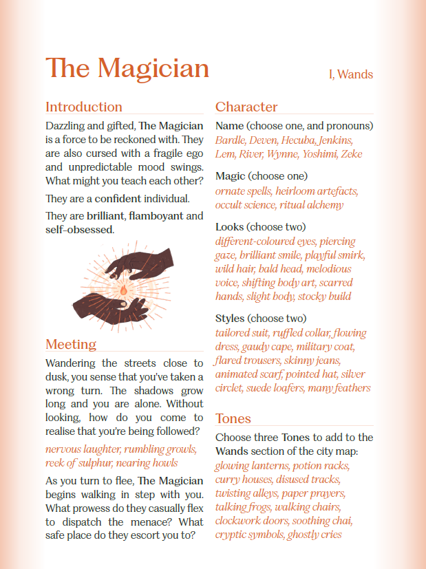 Play begins while you forge a witch from nothing, pretend, and the book. Koriko awaits! A vast and wonderful city decided and designed by you. Koriko might be a cramped, industrialized, sprawl colored by the scent of sweat and smoke. Koriko might be a massive tree whose roots reach the depths of the earth and whose branches are said to scrape the stars. Koriko might be identical to a city you already know. Koriko is a place made by you using the book to guide creation.Β