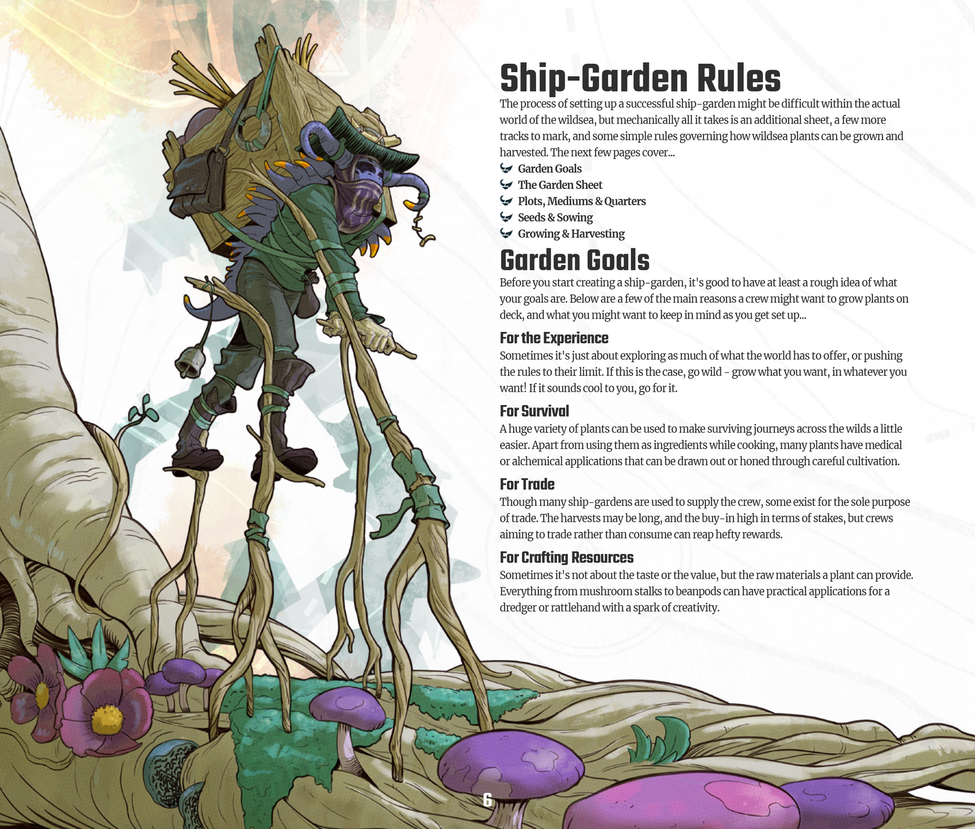 Ships Gardens Supplement contains additional rules for growing, harvesting, and using your own fruits and vegetables on the Wildsea! Includes new illustrations, new post, tables, and a garden sheet.