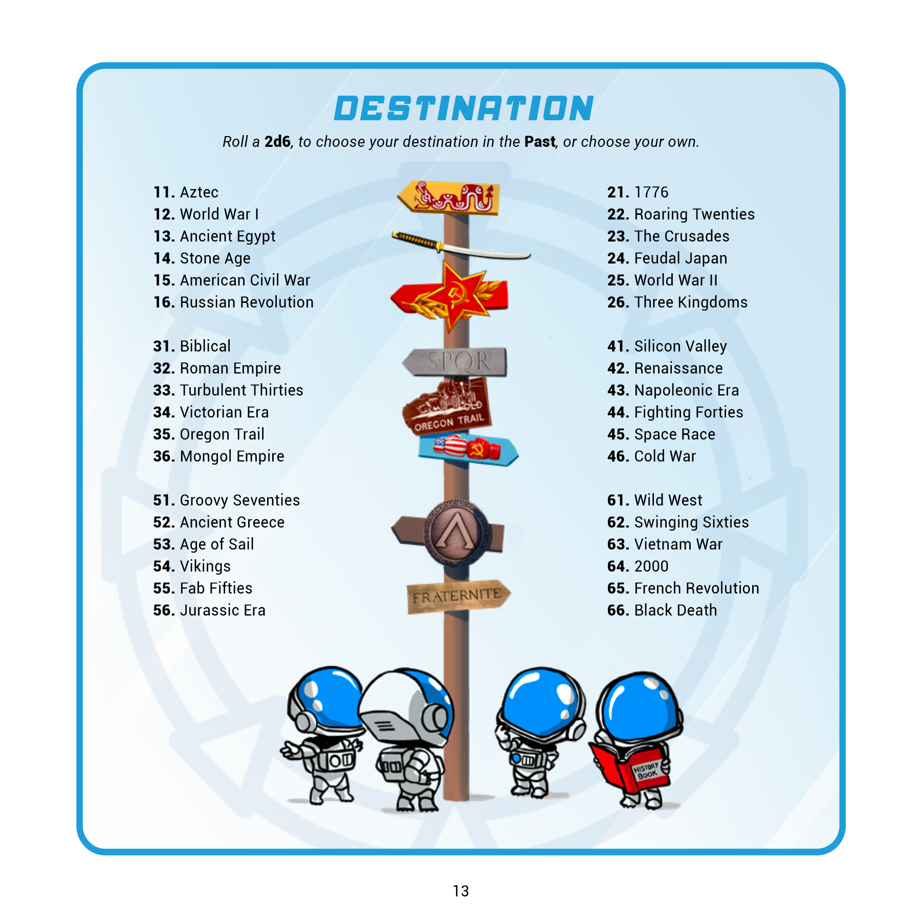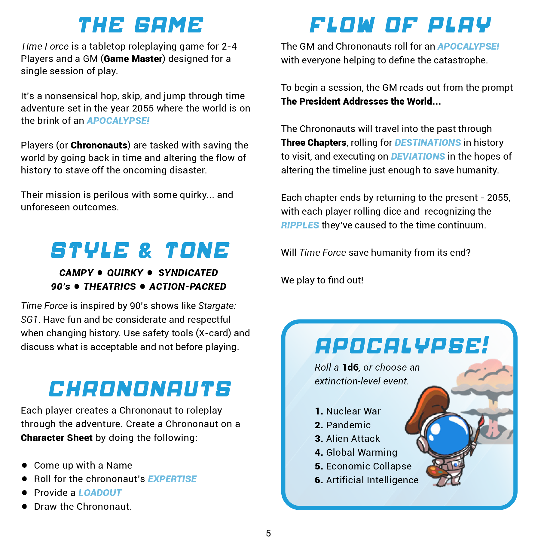 Time Force is a tabletop roleplaying game for 2-4 Players and a GM (Game Master) designed for one-shot play. Using a D6 system it's both easy and fast to pick up. Itβs a nonsensical hop, skip, and jump through time adventure set in the year 2055 where the world is on the brink of an APOCALYPSE!